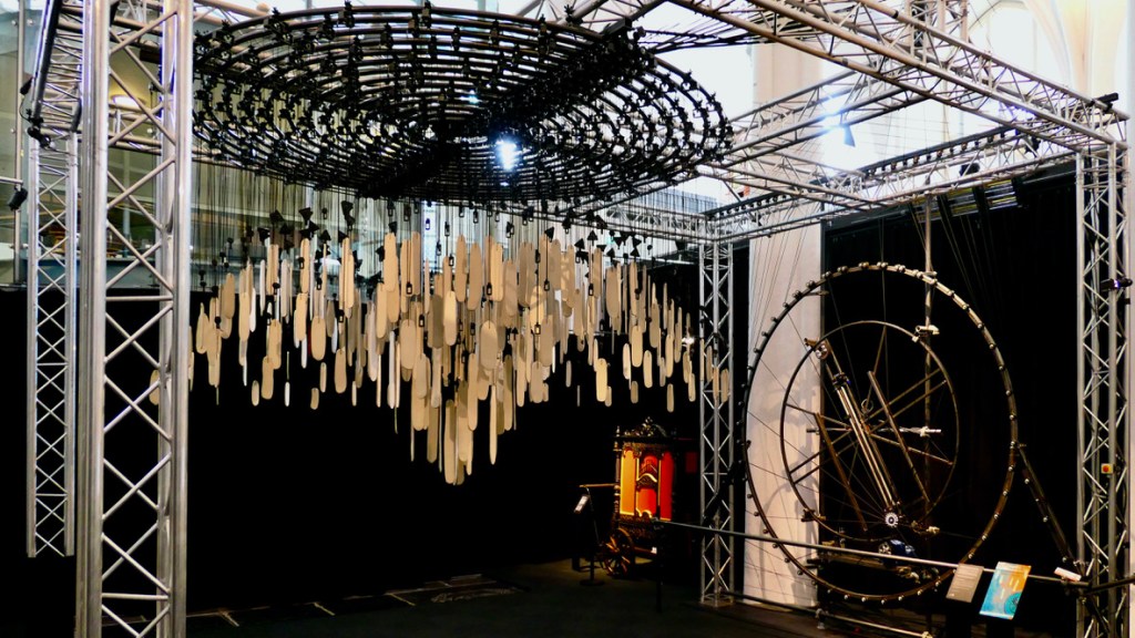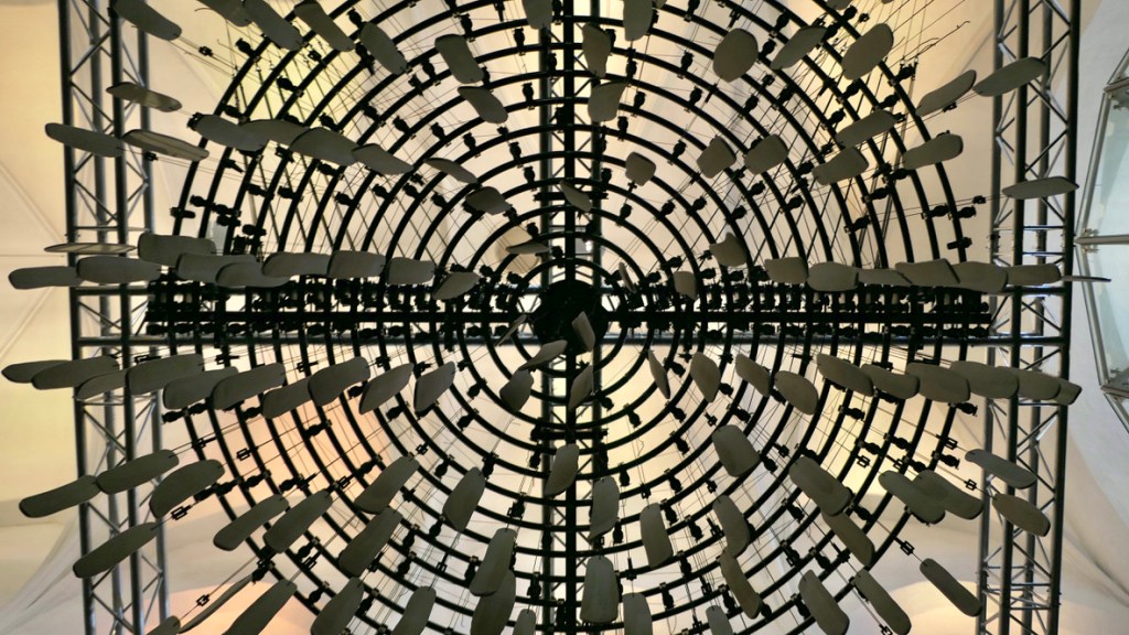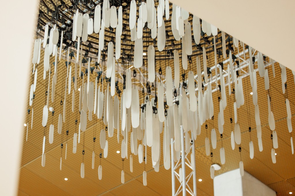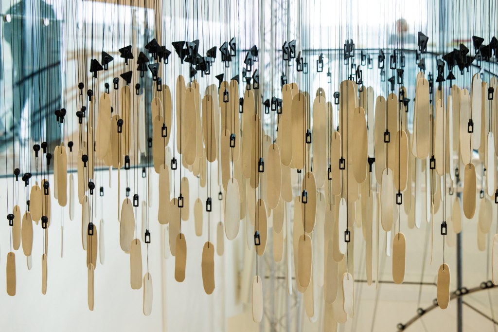 Ceramic sound objects are put into motion by a big mechanism. The handmade and therefore unique sound objects swing and collide with each other, creating sound and timbres in their own way. With Aircilla we want to immerse the audience in a moving landscape.