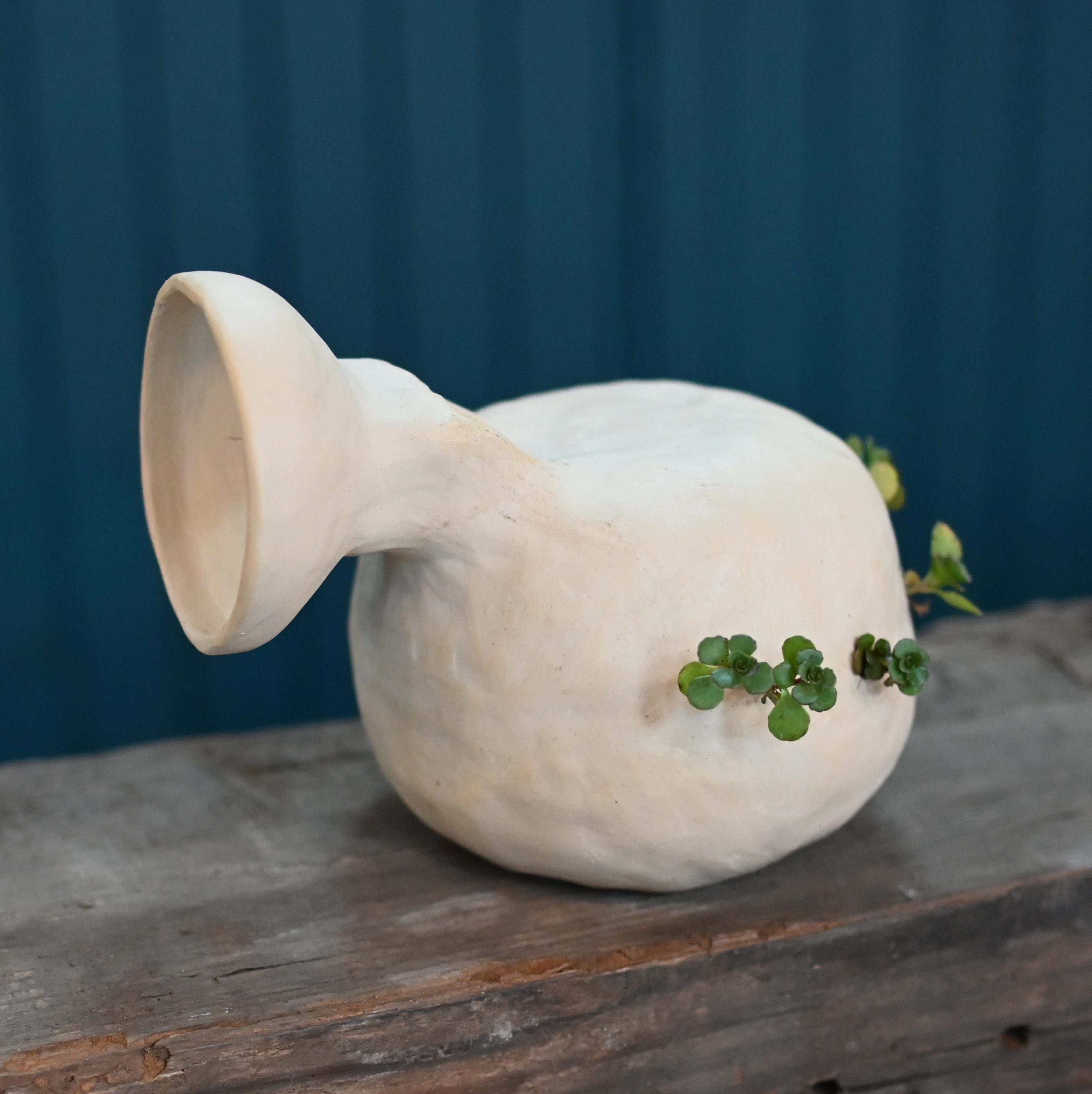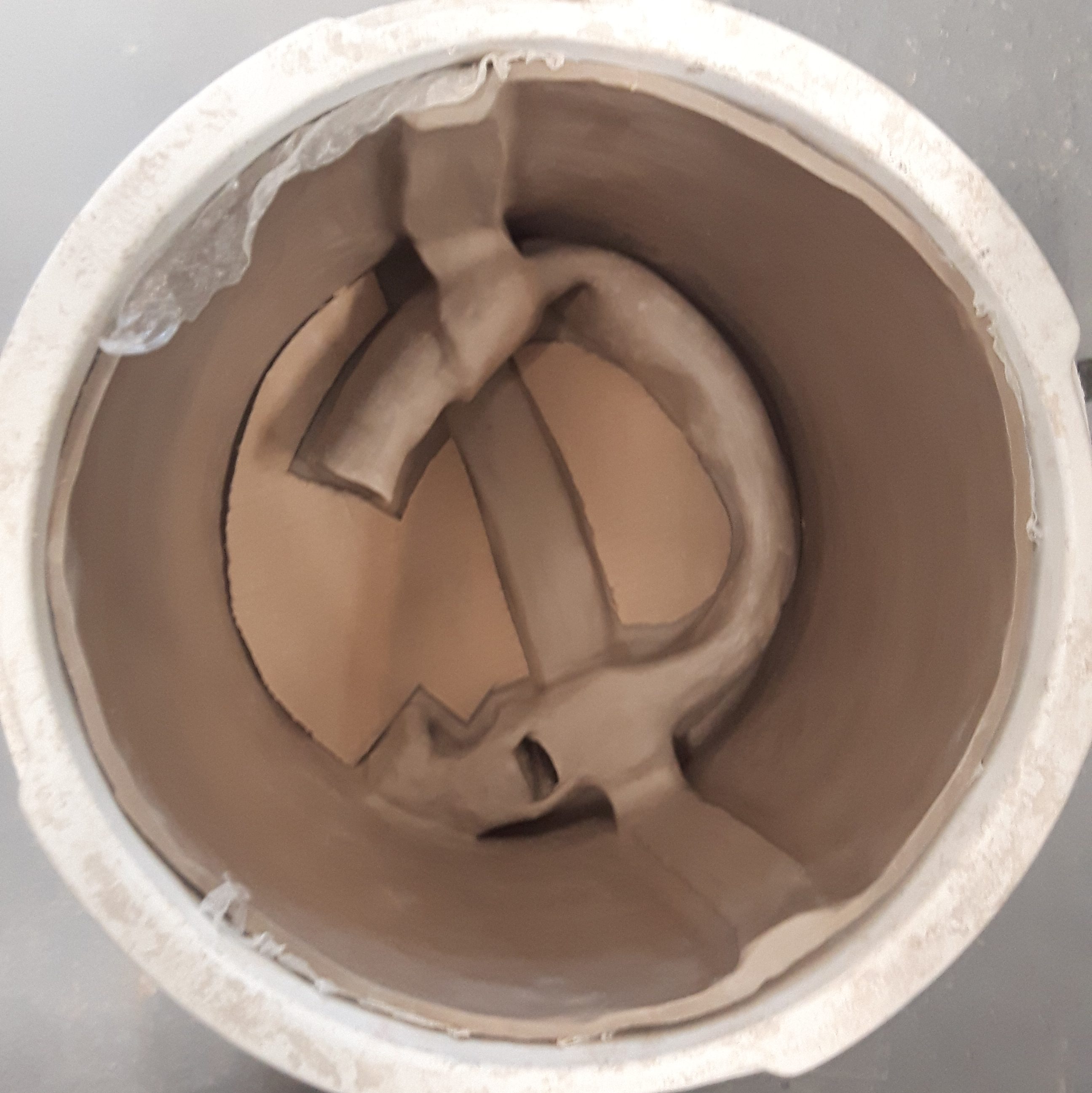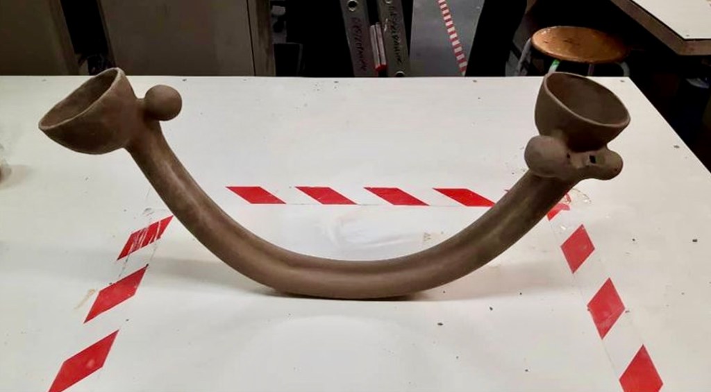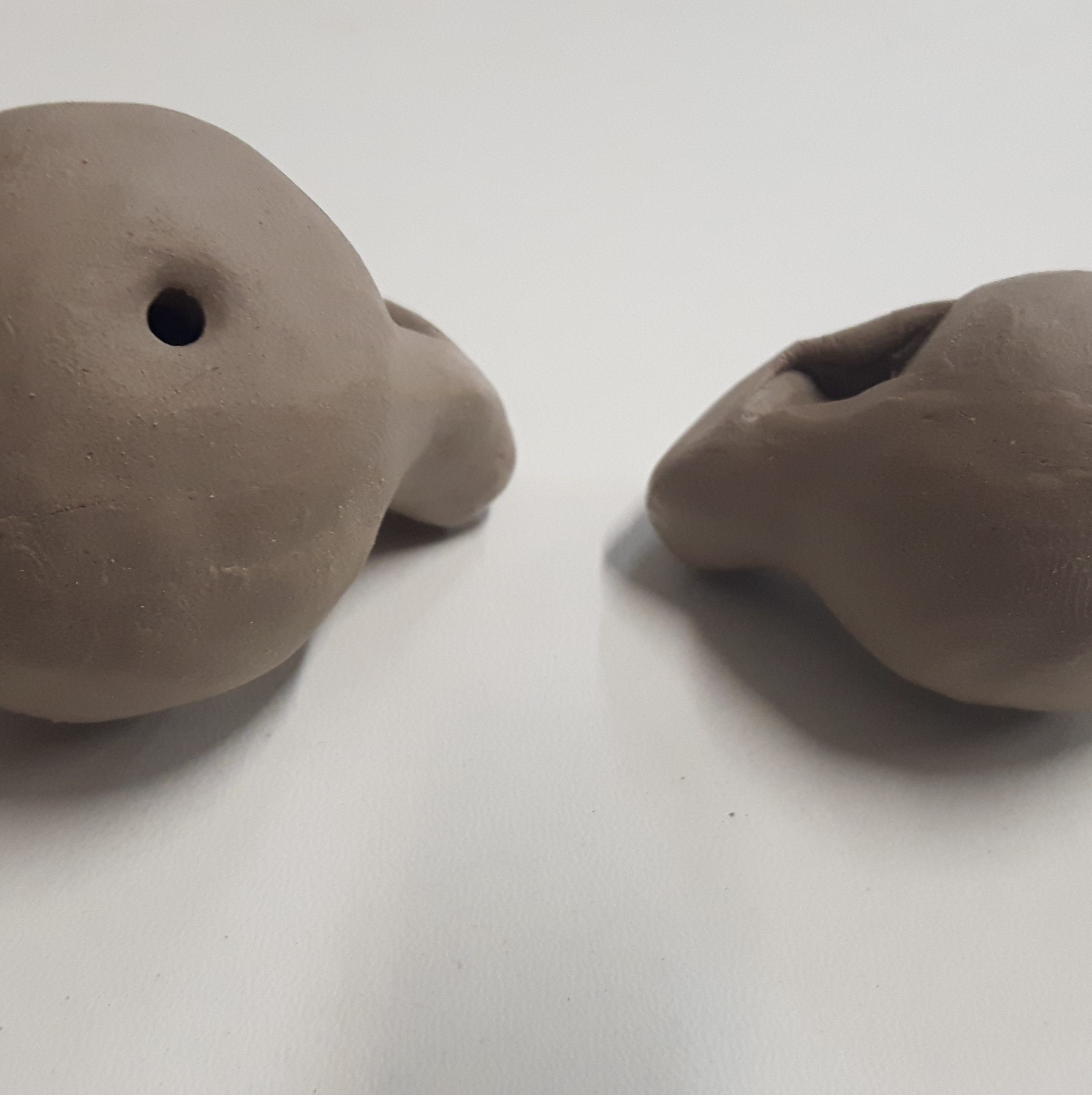 Toen bedacht ik iets veel simpelers, twee Water Ocarinas aan elkaar: twee ingangen voor water (elke ingang aan een kant), twee buizen en vier fluiten (twee fluiten aan elke kant). Twee fluiten per water ocarina was een artistieke keuze/nieuw experiment. Hij zag er goed uit, maar helaas, hij brak in drie stukken. Hij was ook heel fragiel. Toch heb ik de losse onderdelen gebakken, zo ontstonden er twee olifant-fluiten.