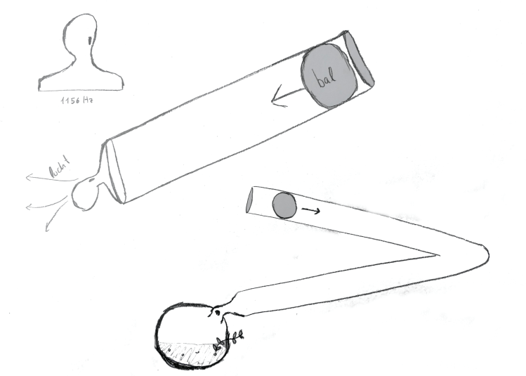 Bespelen met een bal: Hoe kan je een fluit bespelen zonder erop te fluiten? Vorige zomer bedacht ik een nieuwe manier; met een bal of grote knikker. Je hebt een fluit die verbonden is aan een buis waar in de bal precies moet passen. Door de bal te rollen perst hij de lucht richting de fluit, de lucht kan alleen eruit via de fluit en zo gaat hij klinken. Door beweging ontstaat er geluid. Na een aantal pvc-buizen, ballen en grote knikkers verzameld te hebben was mijn waterfles de enige die precies goed in een pvc-buis paste. Ik heb in eerste instantie twee kleine fluiten gemaakt, om dit systeem uit te proberen, en het werkte! Helaas zijn deze twee fluiten kapotgegaan voordat ik ze gebakken had. Daarvan heb ik wel geleerd dat droge klei heel fragiel is. Hieronder volgt een video waarin ik de pompoen-fluit bespeel met mijn waterfles.